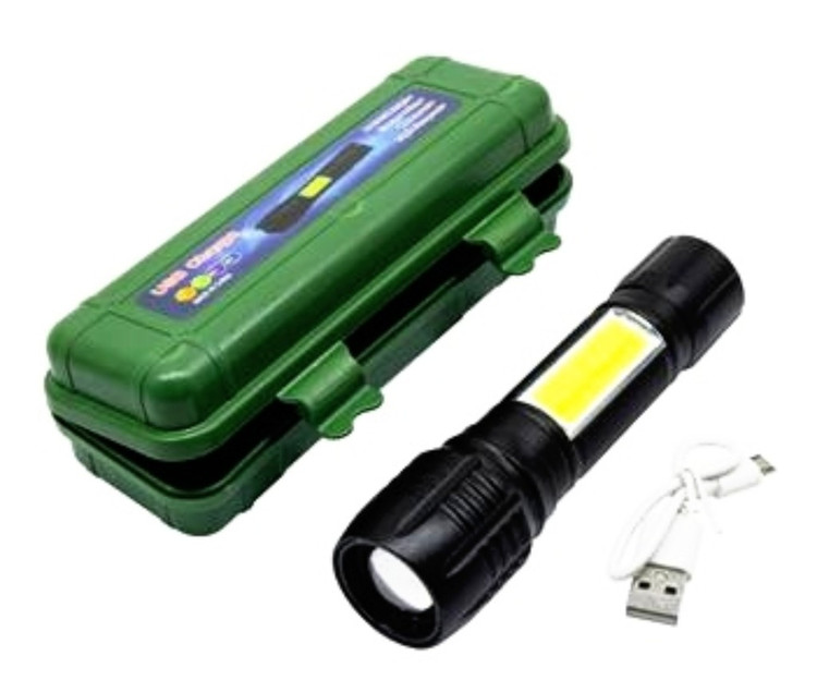 🔦 چراغ قوه شارژی چندکاره با نور جانبی COB مقاوم در برابر آب و جنس فلزی و دارای چند حالت مختلف نور