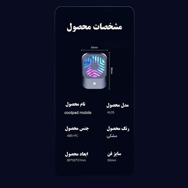 فن خنک کننده رادیاتوری گوشی موبایل مدل AL-5 از سازگاری بسیار بالایی با انواع گوشی های هوشمند تلفن همراه شامل گوشی های اندرویدی و iOS برخوردار است. قدرت خنک کنندگی در این فن رادیاتوری فقط وابسته به فن آن نبوده و برای خنک کردن گوشی از جدیدتری تکنولوژی استفاده می شود که از که به تنهایی از توان بالایی برخوردار است. علاوه بر این قسمت چند لایه آلیاژ آلومینیوم در این فن رادیاتوری موجود می باشد که بر قدرت این محصول تا حد زیادی افزوده است. این محصول دارای 3 حالت سرعت می باشد و با سرعت چرخش مناسب هوای گرم را در سریع ترین زمان از گوشی می گیرد. در قسمت فن این محصول از نور پردازی با نور های RGB استفاده شده که در هنگام بازی هیجان بسیار زیادی ایجاد می کند. فن خنک کننده رادیاتوری گوشی موبایل مدل AL-5 با داشتن گیره به سادگی و سرعت خیلی بالا بر روی هر نوع گوشی هوشمند نصب می شود. این محصول دارای باتری می باشد و با شارژ کردن آن ساعت ها امکان بازی به صورت بی سیم را امکان پذیر می باشد.