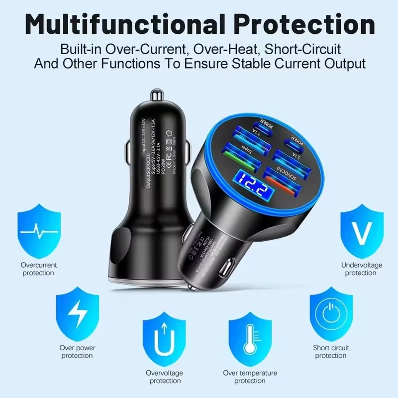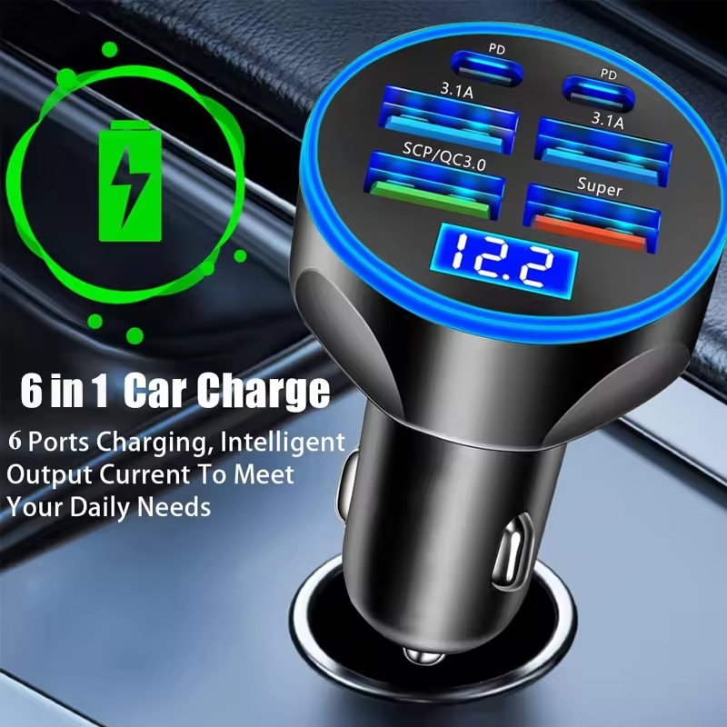 G50 6-port fast charging cigarette lighter charger with Type-C charging cable