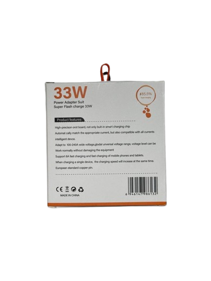 با ست شارژ سریع 33 وات، تجربهای متفاوت از شارژ را تجربه کنید. این محصول شامل یک آداپتور دیواری قدرتمند با خروجی 33W و یک کابل USB-C با ظرفیت جریان 6 آمپر است که با فناوری Super Flash Charge، شارژ دستگاههای شما را در کمترین زمان ممکن انجام میدهد.