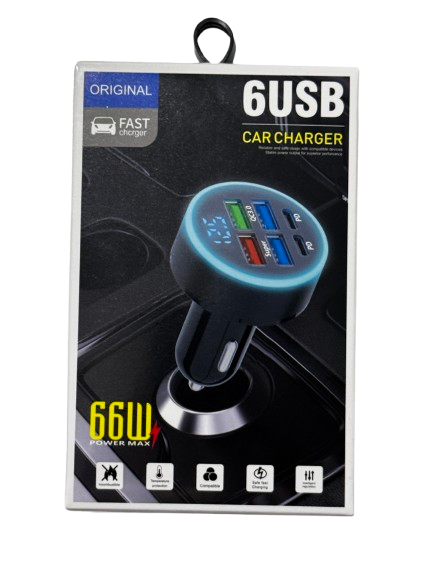 شارژر فندکی 66W شش پورت به همراه کابل دو پورت PD و چهار پورت USB